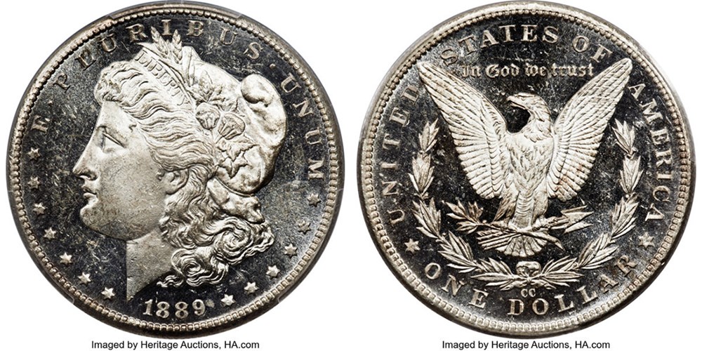- A key to the Carson City series, an 1889-CC Dollar MS63 Deep Mirror Prooflike PCGS. CAC, the 1889-CC is by far the single most desirable Morgan dollar from the Carson City Mint, bolstered by a mintage that was low even by the latter-year standards of the Nevada facility — and one where many specimens wound up being melted later. One estimate suggests as many as 92%, or 325,000 of the 350,000 pieces struck, may have been destroyed under terms of the 1918 Pittman Act.