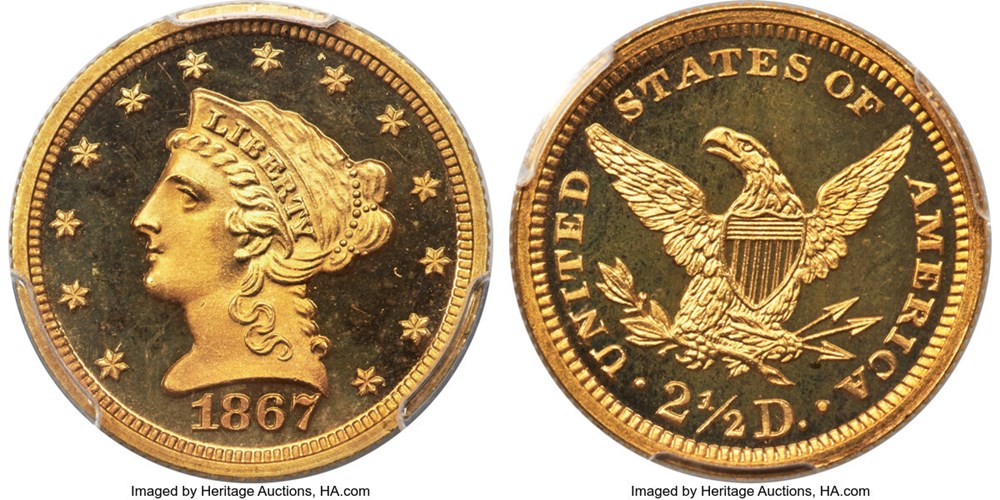 An 1867 Quarter Eagle, PR67 Deep Cameo PCGS that is tied for the finest certified example of the coin sparked a frenzy of 64 bids before setting an auction record at $105,000, surpassing the previous record of $99,875 that had stood since 2013. The Philadelphia Mint struck a relatively generous mintage of 50 proof Liberty quarter eagles for collectors in 1867, along with a meager business-strike production of 3,200 pieces. Despite the larger-than-average mintage, the 1867 proof quarter eagle is just as rare as the proofs of earlier years that had half the production totals. It is believed that many examples went unsold and were melted after the end of the year. John Dannreuther estimates the surviving population at 14-16 examples in all grades.