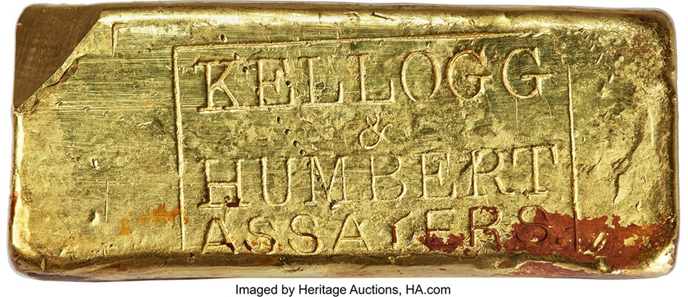 Kellogg & Humbert Gold Ingot weighing 26.30 ounces also realized $146,400. This medium-sized ingot, poured into Mold K&H-02, carries one of the higher fineness grades among comparable Kellogg & Humbert pieces recovered from the S.S. Central America, and its serial number is among the highest known for the mold. Another Kellogg & Humbert Gold Ingot, weighing 26.55 ounces, brought $140,300. Of the 343 Kellogg & Humbert ingots recovered during the first salvage expedition, 80 were poured from the KH-02 mold, making these pieces part of the largest single-assayer representation within the famous shipwreck treasure.