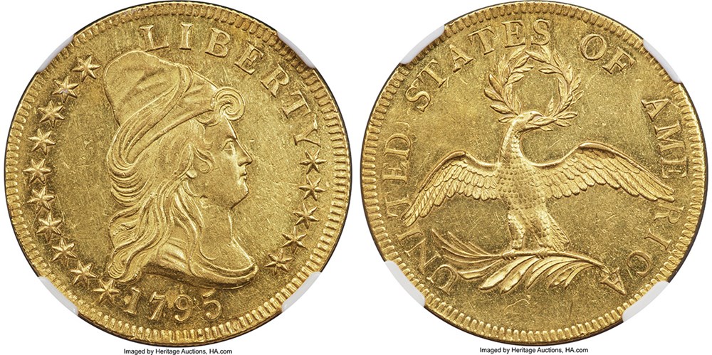 A 1795 BD-1 Eagle, MS61 NGC, a beautiful example of the popular “13 Leaves” variety that is one of the most highly sought type coins in the U.S. gold series, brought a winning bid of $132,000. As the largest gold coin in the realm at the time, the early ten dollar gold pieces were intended to compete with the circulating Spanish eight escudo pieces, although in 1795, the half eagle was preferred in both domestic and international trade. Of all of the “13 Leaves” varieties graded by NGC, this is one of just eight graded MS61, and there are only nine carrying higher grades. Another example, graded AU58 PCGS, drew $114,000.