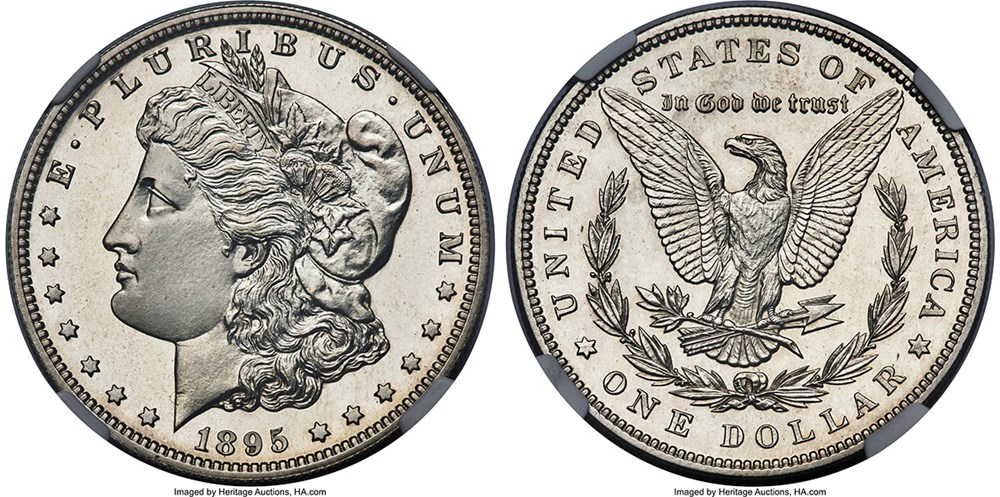 An 1895 Morgan Dollar PR65 Cameo NGC. VAM-2, from an original proof mintage of just 880 pieces, ended at $87,000. Mint records indicated a circulation strike of 12,000, coins that if indeed struck were never paid out. Instead, any circulation coinage was apparently melted under the terms of the 1918 Pittman Act, when about 350 million silver dollars were converted into bullion, leaving only the small proof coinage for collectors to seek out.