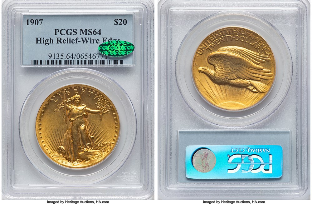 10. On March 26, Heritage auctioned a CAC approved, PCGS graded MS-64 1907 ‘Wire Edge’ High Relief $20 gold coin for $47,580. The two previous lots were PCGS graded and NGC graded MS-64 1907 ‘Wire Edge’ High Relief $20 gold coins, neither of which had a CAC sticker, and each brought the same price, $36,600.