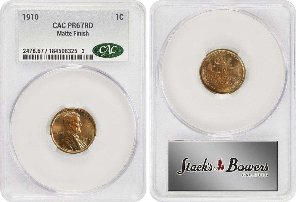 2. On March 10, Stack’s Bowers auctioned a CACG certified Proof-67-Red 1910 Lincoln cent for $16,800. On Jan. 15, Heritage auctioned a PCGS certified Proof-67-Red 1910 Lincoln cent, without a CAC sticker, for $10,065. Both of these received a ‘Full Red’ (RD) designation from the respective grading service.