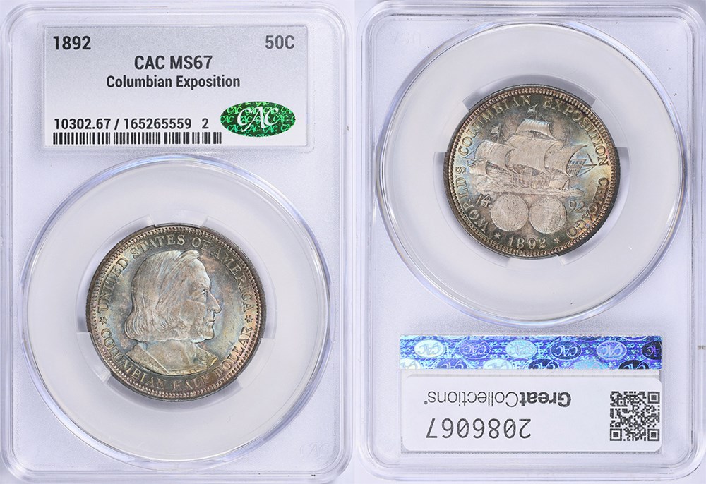 6. On March 15, GreatCollections sold a CACG graded MS-67 1892 Columbian Exposition commemorative half dollar for $3,644.30. On March 28, Heritage sold an NGC graded MS-67 1892 Columbian half dollar, without a CAC sticker, for $1,586. On March 13, Stack’s Bowers sold an NGC graded MS-67 1892 Columbian half dollar, without a CAC sticker, for $1,680. On March 1, GreatCollections sold an NGC graded MS-67 1892 Columbian half dollar, without a CAC sticker, for $2,108.70.