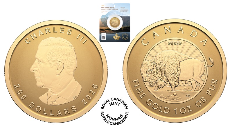 Designed by Claudio D’Angelo, the coin’s reverse features sunburst radial lines behind the inspiring side view of a mighty grazing bison, representing the timeless spirit of Canadian natural heritage. Just above the image of the bison, the numbers 99999 in reference to the purity and fineness of the coin’s gold content. Above the primary design along the upper rim is the text CANADA and below, along the lower rim are the specifications FINE GOLD 1 OZ OR PUR. The obverse side includes the effigy of HM King Charles III created by Canadian artist Steven Rosati and depicts the King facing to the left surrounded by the legend CHARLES III CANADA D G REX. The denomination 200 DOLLARS and year of issue, 2026 is placed below the King’s likeness along the lower rim. The coins’ edge features serrations or reeding alternating with smooth surfaces.