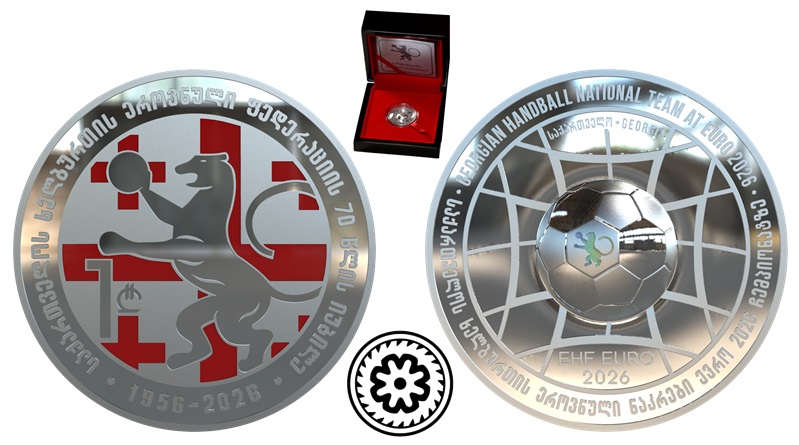 The silver proof and colour coins are produced by the National Mint of Kazakhstan at their facilities in Oskemen, East Kazakhstan and on behalf of the National Bank of Georgia. Designed by Giorgi Zhghenti with additional input from the Georgian National Handball Federation, the obverse side featuredetails of the logo of the Georgian Handball Federation. The logo comprises the image of a heraldic lion hitting a handball against the background of the Georgian flag which is presented in red and white colour. The face value of the coin is shown as 1 ₾ in the lower left corner. Along the rim is the inscription in Georgian lettering საქართველოს ხელბურთის ეროვნული ფედერაციის 70 წლის იუბილე (70th Anniversary of the National Handball Federation of Georgia) with the commemorative year dates 1956 – 2026 placed below the primary design along the lower rim. The reverse side features an illustration of a handball scored into the goal represented by a handball net in the background. A heraldic lion is also shown on the surface of the handball representing the Georgian Handball Federation. Above the handball is the name of the national team in Georgian and English text საქართველო ★ GEORGIA. The text EHF EURO 2026 is shown just under the handball. Above the primary design along the upper rim is the commemorative text in English GEORGIAN HANDBALL NATIONAL TEAM AT EURO 2026 and along the lower rim is the same text in Georgian საქართველოს ხელბურთის ეროვნული ნაკრები ევრო 2026 ჩემპიონატზე.