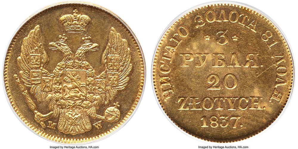 1837 Warsaw-minted 20 Zlotych leads event at $73,200.