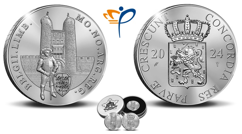 According to the Dutch Mint Act, a knight in armour is to be included in the design on the coin. For this series, Karel van Egmond (1467 – 1538) is depicted and has place of honour. This armored man on the obverse was an important duke of several areas in the Netherlands. His reign was threatened by the superior authority of the Emperor Charles V and as such he is remembered as having been the last independent feudal ruler of the Netherlands. The obverse of the Helpoort Silver Ducat depicts Duke Karel van Egmond in front of the landmark Gate. The provincial crest of Limburg is depicted on his shield. The Latin abbreviation inscription surrounding the primary design reads MO.NO.ARG.REG.BELGII.LIMB and in full is Moneta Nova Argenta Regni Belgii which translates as ‘New Silver coin of the Kingdom of the Netherlands’. LIMB denotes the province of Limburg. On the reverse of the Silver Ducat, the crowned national coat of arms of the Netherlands is centred. On either side are the numerals 20 and 24 denoting the year of issue along with the Dutch Mint’s mintmark and privy mark. The inscription surrounding the crest reads CONCORDIA RES PARVAE CRESCUNT (Unity makes Strength).