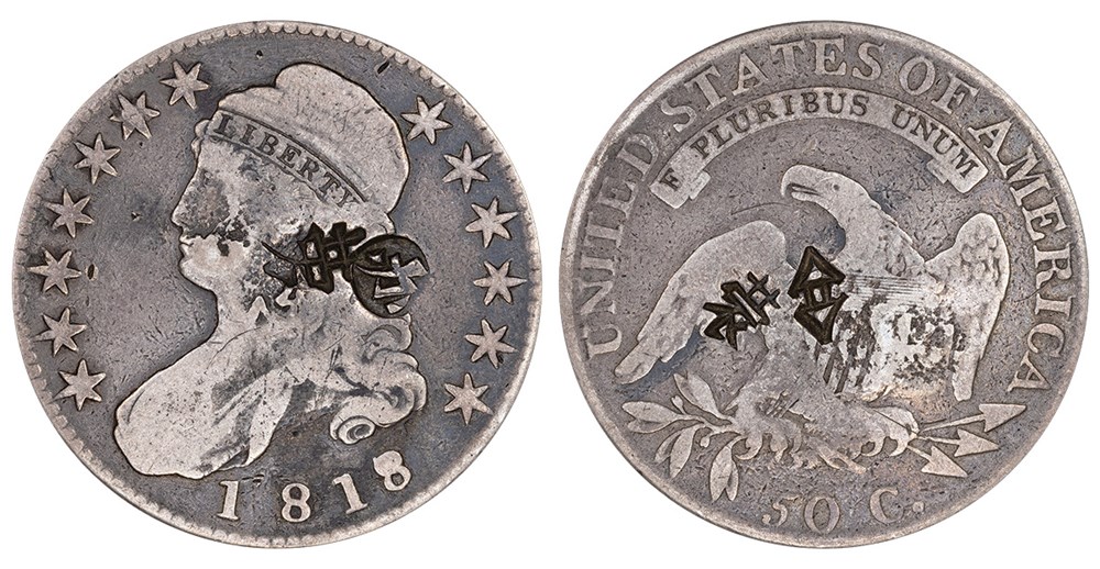 The story of Capped Bust half dollars in the China trade is a captivating one, however a challenging one for collectors. There are very few of that series available with chop marks upon them to collect. Specialists who collect chop marked coins rarely have more than one example. Readers may wonder why there are a good number of chopped U.S. Trade dollars and so few chopped Bust halves. That is because the Trade dollar circulated extensively in China and Hong Kong and became an integral element of East Asian commerce. On the other hand, the Capped Bust half dollar was used to supplement Spanish-American dollars and were mostly melted down and made into sycee bullion.