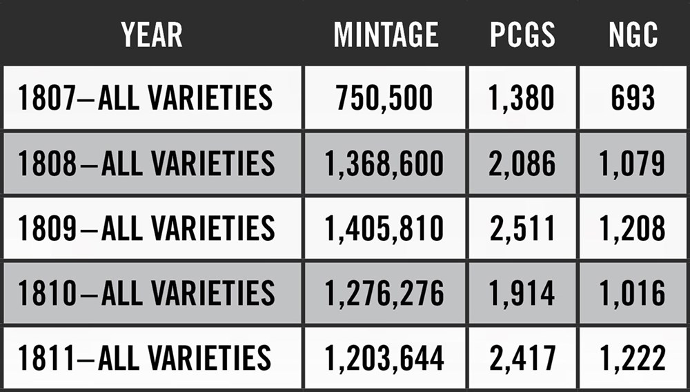 The below table presents circumstantial evidence, suggesting that great numbers of Capped Bust halves indeed ended up in China. Analyzing the number of graded pieces vis-à-vis the original mintage is an interesting method of research, which provides an indication of rarity.