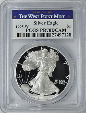 The 1995-W is a legendary American Silver Eagle coin. Numismatists know that this coin was only available as part of the 1995 10th Anniversary American Eagle Proof Set. The coins in that set were a one Troy ounce American Gold Eagle, a half ounce American Gold Eagle, a quarter ounce American Gold Eagle, a tenth ounce American Gold Eagle, and the 1995-W American Silver Eagle.