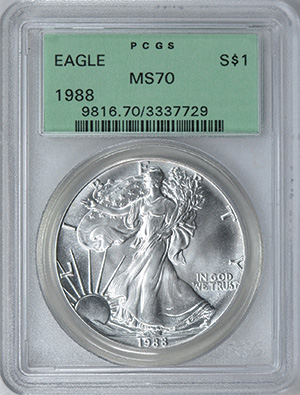The 1988 American Silver Eagle coin is difficult to acquire in high grade. In fact, the top grade of MS70 is extremely elusive. The total mintage was 5,004,646 coins and when a high-graded specimen came to auction at GreatCollections in April of 2013, housed in a PCGS Old Green Holder, it was purchased for $27,500.