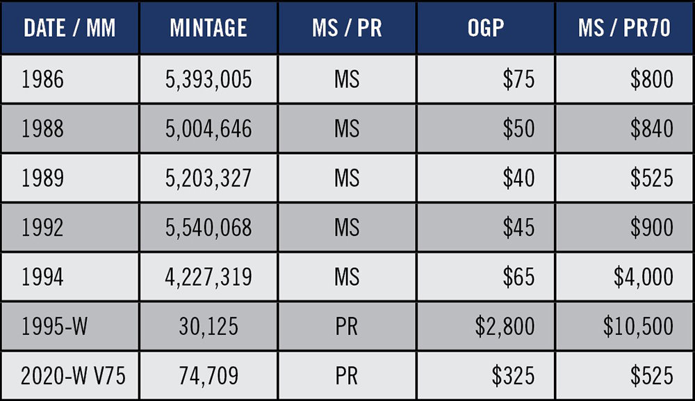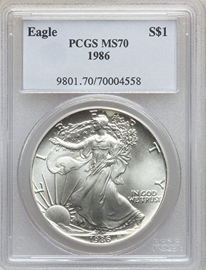 While the Mint practiced its usual care and concern for the coins that were struck, the numbers of these bullion coins that have eventually been certified Mint State-70 are few indeed. In fact, years after the striking in 1986, the top-graded coins are still very scarce. In fact, an MS70-graded coin in a PCGS holder sold in a Heritage Auctions sale on February 8, 2013 for an amazing $21,150.