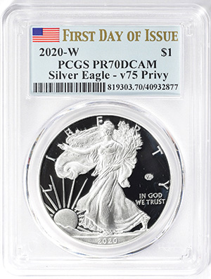 The U.S. Mint offered both of these coins on their website which was overwhelmed repeatedly due to the crush of dealers, collectors, and investors all trying to acquire these coins. On November 22, 2020, GreatCollections sold a 2020-W American Silver Eagle with the V75 Privy Mark, graded PCGS PR70 First Day of Issue for $2,418.75.