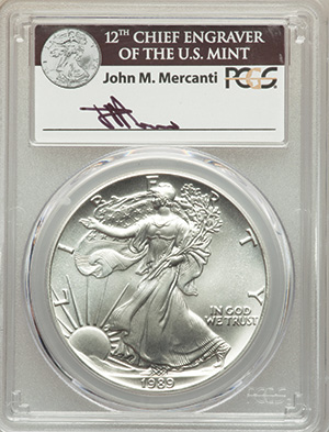 The 1989 American Silver Eagle is yet another early issue where a high grade example brought a remarkable price for a Silver Eagle. The designer of the reverse, John M. Mercanti, had signed a special insert in this PCGS certified MS70 coin. The total mintage was 5,203,327 coins but when this Mercanti signed coin came up for auction in July of 2016 at Heritage Auctions it was one of only 3 coins graded as MS70 by PCGS. This gorgeous coin was hammered down for $14,100.