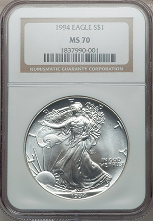 The 1994 American Silver Eagle has the second lowest mintage with only 4,227,319 coins struck. Beginning around 1991, many American Silver Eagle coins were plagued with white "milk spots" which prevented the coins from receiving the highest grades and were considered unattractive. On November 12, 2013, Heritage sold a 1994 American Silver Eagle, graded by NGC as MS70 for $11,162.50. The beautiful coin was remarkably spot-free.