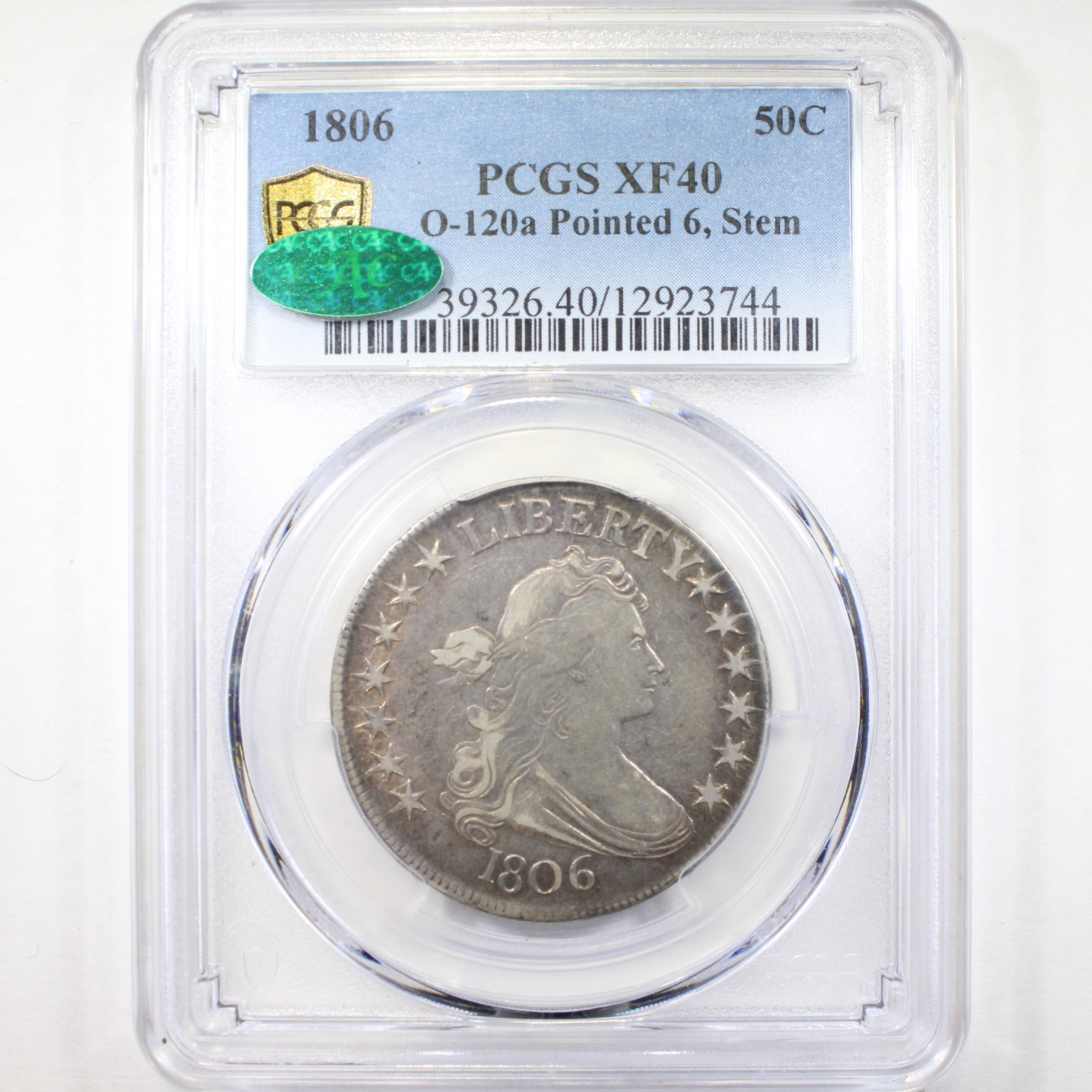 1806 Pointed 6, Stem, O-120a 50c PCGS XF40