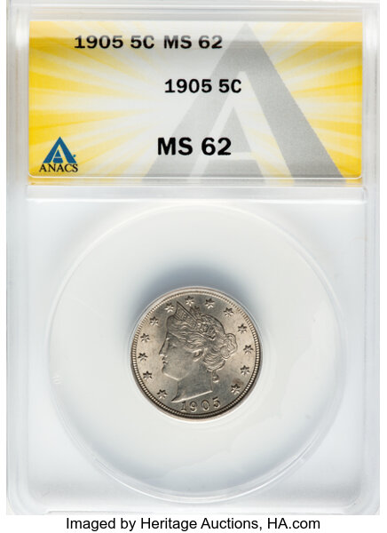 Reverse: A full portrait of the bison, Black Diamond, with the words UNITED STATES oF AMERICA at the top periphery with the motto E PLURIBUS UNUM just underneath. The denomination FIVE CENTS is spelled out at the bottom. For the Type 1, the denomination is embossed on a flat surface.
