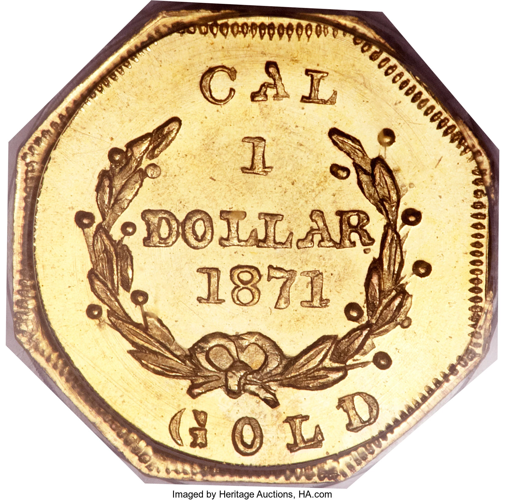 Issued in round and octagonal shapes and three denominations of 25-cents, 50-cents, and one-dollar. These small gold issues are intricate miniatures of large gold coins yet no bigger than the size of a fingernail, and were struck to fill a void of circulating coinage in the territory. There are approximately 590 different varieties of the three denominations cataloged in the Breen-Gillio (BG) reference guide.