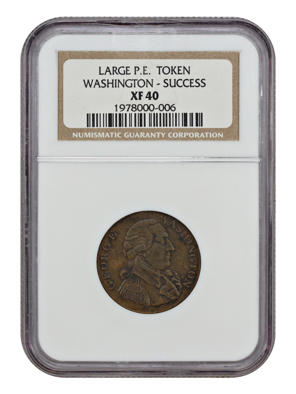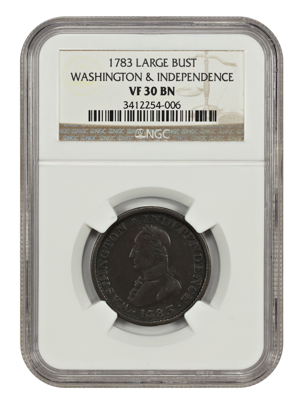 Medals, tokens, and coinage proposals in this interesting series dated from 1783 to 1795 bear the portrait of George Washington. The likenesses in most instances were faithfully reproduced and were designed to honor the first president. Many of these pieces were of English origin and were made later than their dates indicate. The legends generally signify a strong unity among the states and the marked display of patriotism that pervaded the new nation during that period. We find among these tokens an employment of what were soon to become the nation's official coin devices, namely, the American eagle, the United States shield, and stars. The denomination ONE CENT is used in several instances, while on some of the English pieces HALFPENNY will be found. Several of these pieces were private patterns for proposed coinage contracts.