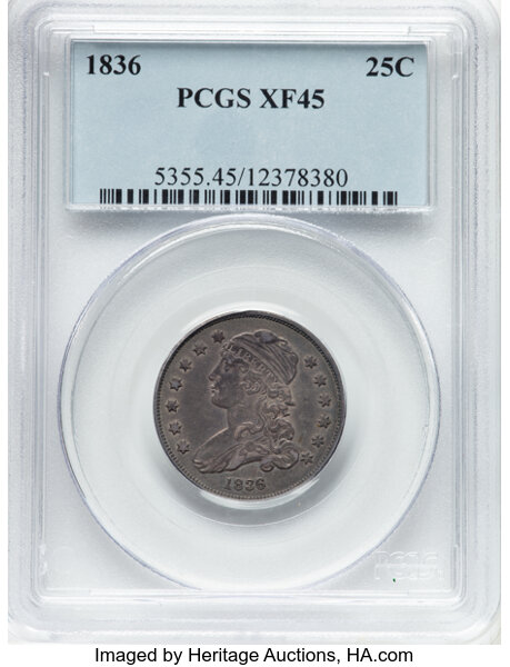 Proof Liberty Seated quarters were struck throughout the duration of the series, which designed by Christian Gobrecht and spanned a period stretching from 1838 through 1891. While the Liberty Seated design was popular and was shared on most United States silver coins, several modifications were made to the motif. The major sub-varieties in the Liberty Seated quarter series are: Variety 1: No Motto Above Eagle (1838-1853) Variety 2: Arrows at Date, Rays Around Eagle (1853) Variety 3: Arrows at Date, No Rays (1854-1855) Variety 1 resumed: with Weight Standard of Variety 2, 6.22 Grams (1856-1865) Variety 4: Motto Above Eagle (1866-1873) Variety 5: Arrows at Date (1873-1874) Variety 4 resumed: with Weight Standard of Variety 5, 6.25 Grams (1875-1891) Proof Liberty Seated quarters are scarce, though several issues are significantly challenging and expensive, most particularly the pre-1860s proofs. Cameo and deep cameo Liberty Seated proofs quarters are very desirable and usually command significant premiums over typical bid and retail prices.