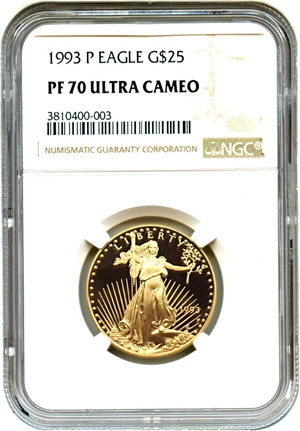 Proof $25 gold eagles have been struck since 1987 and are popular with collectors and investors who seek a nicer-than-average specimen of this widely recognized half-ounce bullion coin. The gold American Eagle is a beautiful coin, most especially in proof. The obverse design, which shows Miss Liberty striding before a sunrise, was designed by world-renowned artist Augustus Saint-Gaudens and first appeared on $20 gold double eagles made from 1907 through 1933. On the reverse of the proof $25 gold eagle is a family of birds around a nest in a design by Miley Busiek. From 1987 through 1991, the date on the proof $25 gold eagle is expressed in traditional Roman numerals. Since 1992, the date has been displayed in common Arabic numerals. Virtually no proof $25 gold eagle is considered rare in terms of mintage or overall availability in the marketplace. Perhaps the only exception to this is the 2008-W proof specimen, which seems to trade at higher levels, despite the fact its mintage of 22,062 is not the lowest in the series to date. Across the board, issues in PR70 tend to command higher premiums. However, this falls in line with the marketplace situation surrounding most American Eagles, which are widely sought and traded at that top grading level. While certified $25 gold eagles grading PR70 are highly popular with collectors and investors, many individuals prefer spotless examples in their original government packaging.