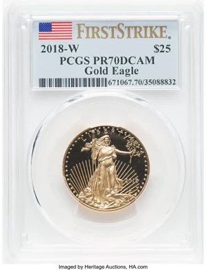 Proof $25 gold eagles have been struck since 1987 and are popular with collectors and investors who seek a nicer-than-average specimen of this widely recognized half-ounce bullion coin. The gold American Eagle is a beautiful coin, most especially in proof. The obverse design, which shows Miss Liberty striding before a sunrise, was designed by world-renowned artist Augustus Saint-Gaudens and first appeared on $20 gold double eagles made from 1907 through 1933. On the reverse of the proof $25 gold eagle is a family of birds around a nest in a design by Miley Busiek. From 1987 through 1991, the date on the proof $25 gold eagle is expressed in traditional Roman numerals. Since 1992, the date has been displayed in common Arabic numerals. Virtually no proof $25 gold eagle is considered rare in terms of mintage or overall availability in the marketplace. Perhaps the only exception to this is the 2008-W proof specimen, which seems to trade at higher levels, despite the fact its mintage of 22,062 is not the lowest in the series to date. Across the board, issues in PR70 tend to command higher premiums. However, this falls in line with the marketplace situation surrounding most American Eagles, which are widely sought and traded at that top grading level. While certified $25 gold eagles grading PR70 are highly popular with collectors and investors, many individuals prefer spotless examples in their original government packaging.